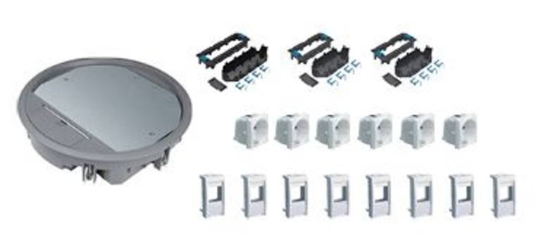 Gulvboksen er inklusiv universelt fastgørelsessæt, for montage i trægulve, betongulve eller EDB-gulve. Montageboxe for kontaktmateriel kan sænkes i trin op til 18 mm.