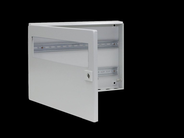 BG Buskabinet, BHD: 400 x 300 x 80 mm, stålplade, med metriske huller i bunden og bæreskinner, låge med observationsvindue, højrehængslet